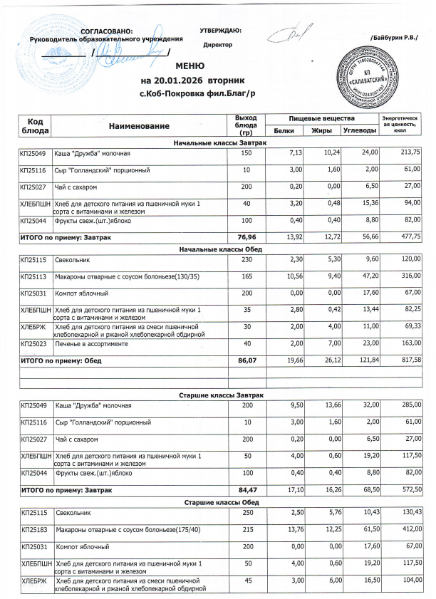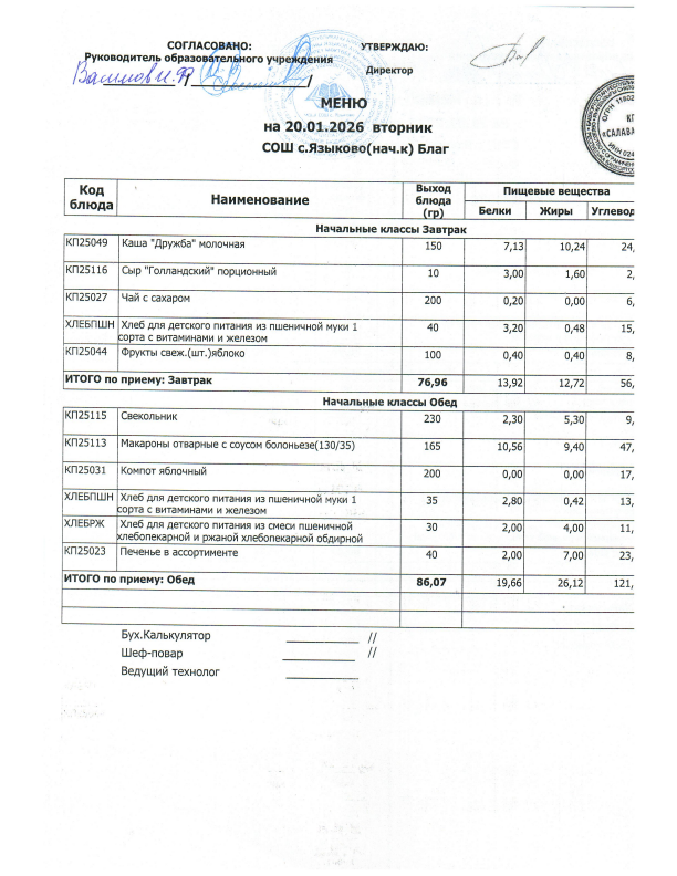 Меню ежедневного горячего питания для филиала муниципального общеобразовательного бюджетного учреждения средняя общеобразовательная школа с.Языково муниципального района Благоварский район Республики Башкортостан основная общеобразовательная школа с. Коб-Покровка.
