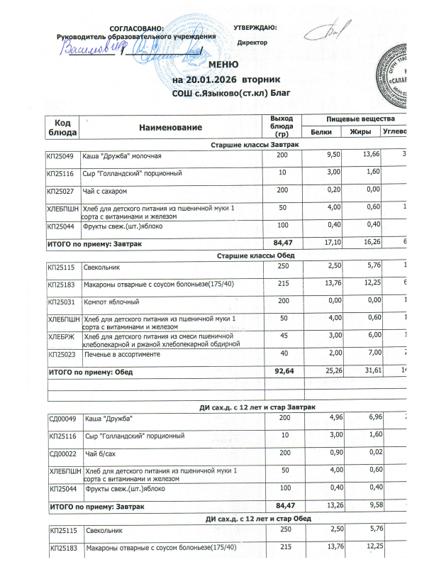 Питание в МОБУ СОШ с. Языково и филиале Коб-Покровка организовано по категориям: